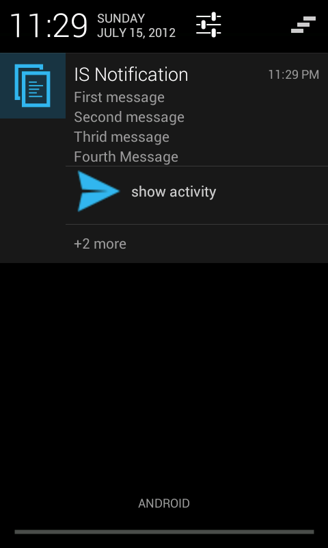 Once you are done with the coding, just execute it. You will see the application as shown in the picture below. On clicking the button you will see the corresponding notification on the upper part of the screen. If you drag the notification down then you can see the entire message and corresponding icon. The pictures below are the notification when they were dragged down.