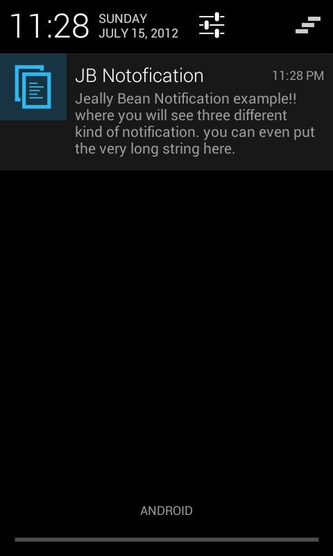 You may have heard about Android Jelly Bean (API level 16). Google has improved a lot of features and introduced new features. One of them is the notification. Now they have made the notification more versatile by introducing media rich notification. Google has come up with three special style of notification which are mentioned below. Even developer can write his own customized notification style using remote view.The old Notification class constructor has been deprecated and a brand new and enhanced version of Notification has been introduced.