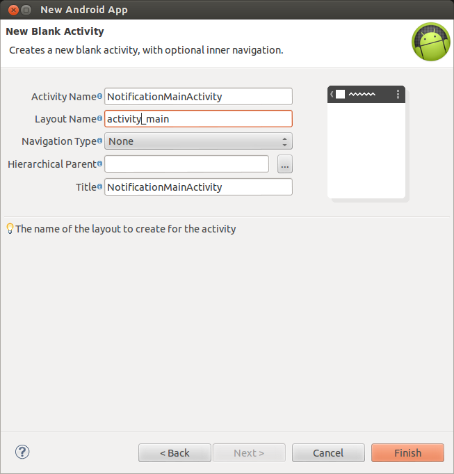 Fill the Activity Name and Layout file name for the dialog box shown below and hit the finish button.