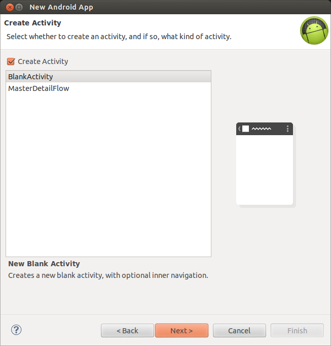 Once the dialog box appears, select the BlankActivity and click the next button.